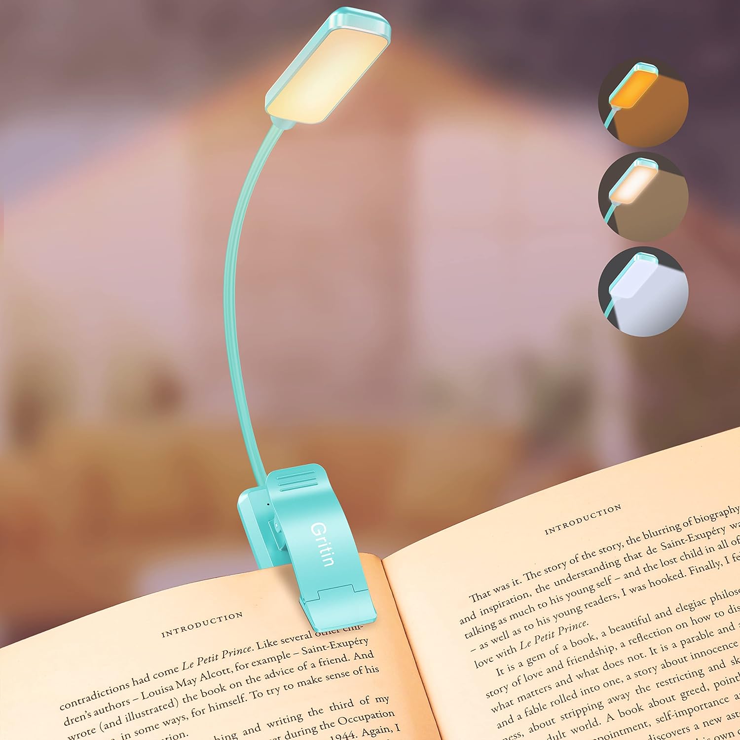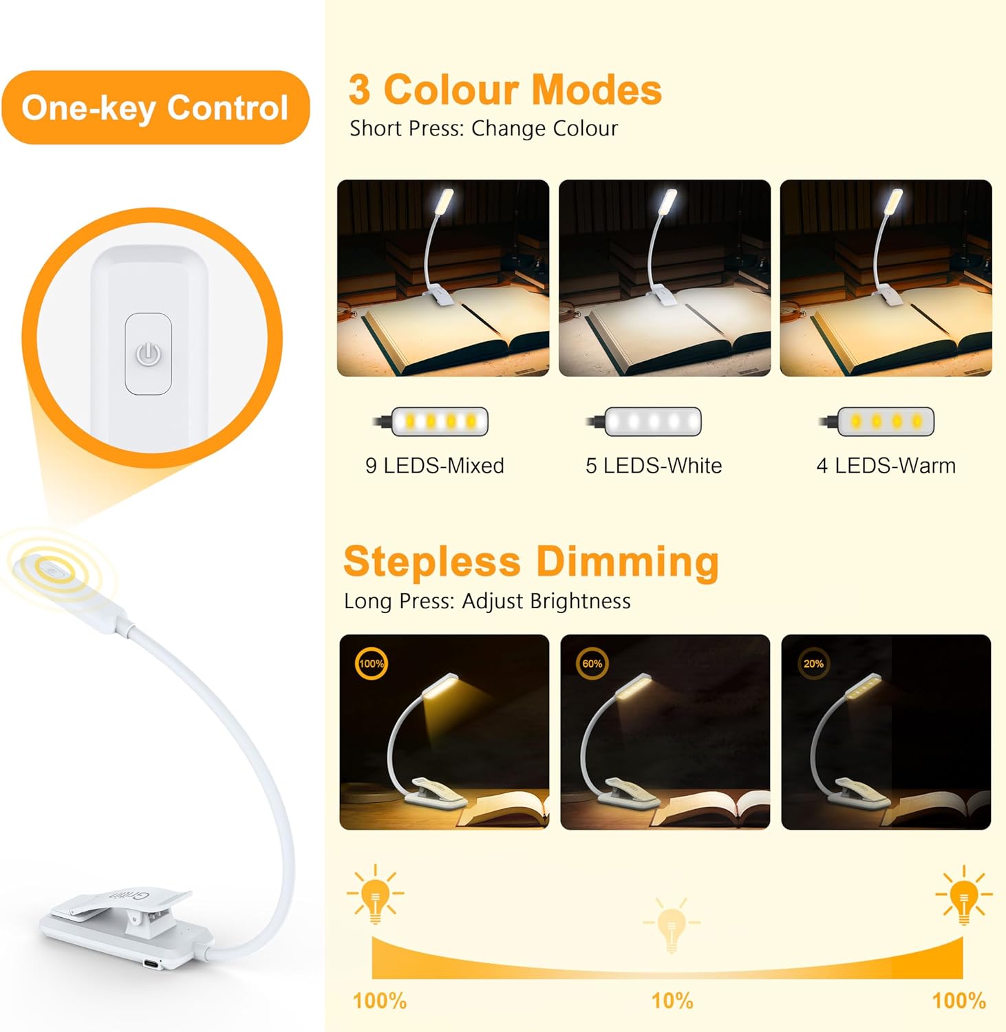 Stepless Dimming and 3 Color Modes: Adjust the brightness from 100% to 10% by long press button to suit different reading environment. Simple switch 3 color temperature lighting modes by clicking the button;mixed color (9 LEDs on), cool white (5 cool white LEDs on), warm (4 warm LEDs on).
